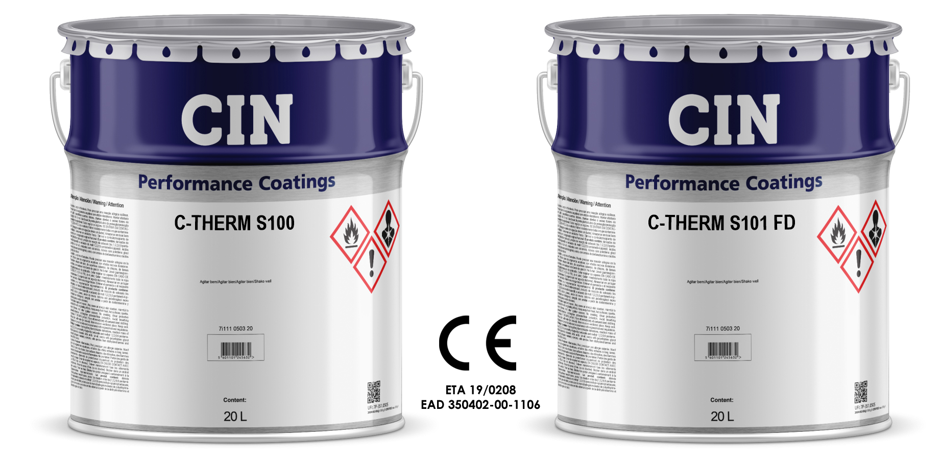 Η νέα γενιά διογκούμενων προϊόντων παθητικής προστασίας της CIN έχει ενισχυθεί με τα ολοκαίνουργια προϊόντα C-THERM® S110 και C-THERM® S111 FD. Πρόκειται για προϊόντα ενός συστατικού βάσης διαλύτου που, υπό υψηλή θερμότητα, παράγουν αφρό πολύ χαμηλής θερμικής αγωγιμότητας, ο οποίος προσδίδει μονωτικές ιδιότητες, προστατεύοντας παθητικά τις μεταλλικές κατασκευές από τη φωτιά. Η εκδόσεις Fast Dry (FD) ξεχωρίζει λόγω του εξαιρετικά γρήγορου στεγνώματος του.